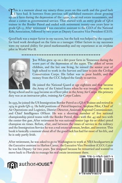 This is a memoir about my ninety-three years on this earth and the good luck I have had. It borrows from previous self-published memoirs about growing up on a farm during the depression of the 1930s, about real estate investments, and about a career in governmental service. That started with an entry grade of GS-6 trainee in the Border Patrol and ended with retirement twenty-one years later in grade GS-15. After retirement I was executive assistant to the CEO of the National Rifle Association, followed by two years as Deputy Executive Vice President (CEO) Good luck was a major factor in my success, but the luck was helped by the capacity for hard work developed on the farm as a teenager. Other factors in my successes were my natural ability for pistol marksmanship and my experience as an airplane pilot in World War II.