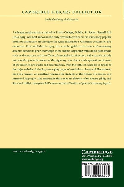 A talented mathematician trained at Trinity College, Dublin, Sir Robert Stawell Ball (1840-1913) was best known in the early twentieth century for his immensely popular books on astronomy. He also gave the Royal Institution's Christmas Lectures on five occasions. First published in 1905, this concise guide to the basics of astronomy assumes almost no prior knowledge of the subject. Beginning with simple phenomena such as the seasons and the effects of atmospheric refraction, Ball expands quickly into month-by-month indexes of the night sky, star charts, and explanations of some of the lesser-known stellar and solar features, from the paths of sunspots to details of the major nebulae. Including over eighty pages of meticulous charts and illustrations, his book remains an excellent resource for students in the history of science, and interested laypeople. Also reissued in this series are The Story of the Heavens (1885) and Star-Land (1889), alongside Ball's more technical Treatise on Spherical Astronomy (1908).