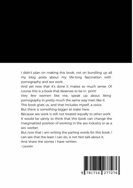 I didn't plan on making this book, not on bundling up all my blog posts about my life-long fascination with pornography and sex work. And yet now that it's done it makes so much sense, and I would not have wanted it any other way. Of course this is a book that deserves to be in print! Very few women like me, speak up about liking pornography in pretty much the same way men like it. This book gives us, and that includes myself, a voice. But there is something bigger at stake here. Because sex work is still not treated equally to other work. Sex work is never treated as the rest of the service industry, and in film and show business it is not treated like the rest of the entertainment industry. Even though sex work and porn pay significantly better than average, offer autonomy, a flexible work schedule, and they are a great equalizer since no diplomas are required to start and if all legal barriers were taken away, there would be ample opportunities for entrepreneurship. It is also the only line of work where women have a competitive advantage and are generally paid more than men. It would be vanity to think that this book can change the marginalized position of working in the sex industry or as a sex worker. These are merely my own diary entries and stories related to the moments I enjoyed pornography, or was inspired by sex workers. I was merely a consumer, a bystander, someone on Twitter. But now that I am writing the parting words for this book, I can see that the least I can do, is not not talk about it. And share the stories I have written and identify myself as sex-work positive, as one sex worker called it. And as porn-positive. And so it is. Lauren Harteveld 12 September 2021
