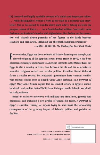 For centuries Egypt has been a citadel of Islamic learning and thought, and since the signing of the Egyptian-Israeli Peace Treaty in 1979, it has been of immense strategic importance to American interests in the Middle East. But Egypt is also a country in crisis, torn between the old and the new, between unsettled religious revival and secular politics. President Hosni Mubarak favors a secular society. But Mubarak's government faces constant conflict with militant clerics such as Sheikh Omar Abdel-Rahman. In A Portrait of Egypt, Mary Anne Weaver argues that an Islamist victory in Egypt is almost inevitable, and, unlike that of Shi'ite Iran, its impact on the Islamic world will be truly profound. Based on exclusive interviews with militants and front men, generals and presidents, A Portrait of Egypt is essential reading for anyone trying to understand the far-reaching consequences of the growing impact of Islamist politics and policies on the West.