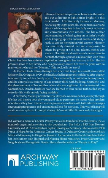 Ellawese Darden is a picture of beauty on the inside and out as her inner light shines brightly in this dark world. Affectionately known as Mommy, now at eighty-eight years old, she remains alert and vibrant while engaging in her daily work activities and conversations with others. She has a clear understanding of whats going on in todays world while keeping up with current events and always ready to discuss her opinion with anyone. Mommy has unselfishly showed love and compassion to others by giving of her time, talents, money and service. Her ultimate devotion and commitment to her faith through a personal relationship with Jesus Christ, has been her ultimate inspiration throughout her journey in life. She is a precious jewel to her family who has graciously shared her over the years with so many others who call her Mommy. This book tells her story! As Darden leads others through her story that began in a small town called Jacksonville, Georgia in 1929, she details a challenging early childhood after tragedy temporarily forced her family apart. They eventually reunited in Pennsylvania, and she chronicles a coming-of-age journey filled with bullying, heartache, and the abandonment of her mother when she was eighteen. As she matured into womanhood, Darden discloses how she learned to lean on her faith to find joy in everyday life while bravely facing hardship. A Portrait of Mommy reveals the true story of a woman and her journey through life that will inspire both the young and old to persevere, no matter what problem or obstacles they face. Darden weaves personal anecdotes with faith-filled messages encouraging forgiveness and unconditional love for everyone. This way of living will create an atmosphere of triumph during lifes most difficult times and challenges.