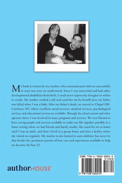 My book is written by my mother, who communicated with me successfully in ways not even we understood. Since I was nonverbal and had other developmental disabilities from birth, I could never express my thoughts or wishes in words. My mother worked a job and cared for me by herself since my father was killed when I was a baby. After my father's death, we moved to Chapel Hill-Carrboro, NC where excellent social services, medical services, psychological services, and educational services are available. Through the school system and other agencies there, I was involved in many programs and services. We were blessed to have caring people and services available to make our life together possible in a home setting where we had friends and family nearby. She cared for me at home until I was an adult, and then I lived in a group home and later a facility where she visited me regularly. My mother is also limited in some abilities, but never let that hinder her persistent pursuit of best care and experiences available to help me become the best VJ.