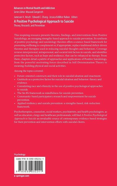 Chapter 1: Positive Psychology and Suicide Prevention: An Introduction and Overview of the Literature.- Chapter 2: Future Oriented Constructs and their Role in Suicidal Ideation and Enactment.- Chapter 3: Forgiveness, Addiction and Suicide.- Chapter 4: Reasons for Living.- Chapter 5: Gratitude as a Protective Factor for Suicidal Ideation and Behaviour: Theory and Evidence.- Chapter 6: Considering Race and Ethnicity Using Positive Psychological Approaches to Suicide.- Chapter 7: Interpersonal Needs and Social Support.- Chapter 8: Encouraging Health-Promoting Behaviors in Primary Care to Reduce Suicide Rates.- Chapter 9: Future-Oriented Treatments for Suicide: An Overview of Three Modern Approaches.- Chapter 10: Meaning-Centered Men's Groups (MCMG) for the Transition to Retirement.- Chapter 11: The Six R's Framework as Mindfulness for Suicide Prevention.- Chapter 12: Community-Based Participatory Research and Empowerment for Suicide Prevention.- Chapter 13: Applied Resiliency and Suicide Prevention: A Strengths-Based, Risk-Reduction Framework.