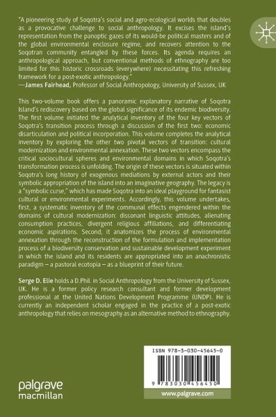 This two-volume book offers a panoramic explanatory narrative of Soqotra Island's rediscovery based on the global significance of its endemic biodiversity. The first volume, A Post-Exotic Anthropology of Soqotra: A Mesography of an Indigenous Polity in Yemen initiated the analytical inventory of the four key vectors of Soqotra's transition process through a discussion of the first two: economic disarticulation and political incorporation. This volume, A Post-Exotic Anthropology of Soqotra: Cultural & Environmental Annexation of an Indigenous Community completes the analytical inventory by exploring the other two pivotal vectors of transition: cultural modernization and environmental annexation. These two vectors encompass the critical sociocultural spheres and environmental domains in which Soqotra's transformation process is unfolding. The origin of these vectors is situated within Soqotra's long history of exogenous mediations by external actors and their symbolic appropriation of the island into an imaginative geography. The legacy is a "symbolic curse," which has made Soqotra into an ideal playground for fantasist cultural or environmental experiments. Accordingly, this volume undertakes, first, a systematic inventory of the communal effects engendered within the domains of cultural modernization: dissonant linguistic attitudes, alienating consumption practices, divergent religious affiliations, and differentiating economic aspirations. Second, it anatomizes the process of environmental annexation through the reconstruction of the formulation and implementation process of a biodiversity conservation and sustainable development experiment in which the island and its residents are appropriated into an anachronistic paradigm - a pastoral ecotopia - as a blueprint of their future.
