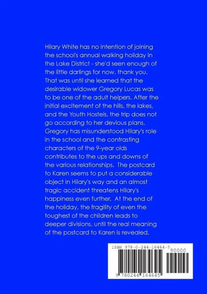 Hilary White has no intention of joining the school's annual walking holiday in the Lake District - she'd seen enough of the little darlings for now, thank you. That was until she learned that the desirable widower Gregory Lucas was to be one of the adult helpers. After the initial excitement of the hills, the lakes, and the Youth Hostels, the trip does not go according to her devious plans. Gregory has misunderstood Hilary's role in the school and the contrasting characters of the 9-year olds contributes to the ups and downs of the various relationships. The postcard to Karen seems to put a considerable object in Hilary's way and an almost tragic accident threatens Hilary's happiness even further. At the end of the holiday, the fragility of even the toughest of the children leads to deeper divisions, until the real meaning of the postcard to Karen is revealed.
