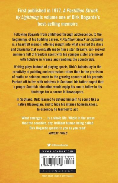 First published in 1977, A Postillion Struck by Lightning is volume one of Dirk Bogarde's best-selling memoirs Following Bogarde from childhood through adolescence, to the beginnings of his budding career, A Postillion Struck by Lightning is a heartfelt memoir, offering insight into what created the drive and charisma that eventually made him a star. Dreamy, sun-soaked summers full of freedom spent with his younger sister are mixed with holidays in France and rambling the countryside. Writing plays instead of playing sports, Dirk's talents lay in the creativity of painting and expression rather than in the precision of maths or science, much to the growing concern of his parents. Packed off to live with relatives in Scotland, his father hoped that a proper Scottish education would equip his son to follow in his footsteps for a career in Newspapers. In Scotland, Dirk learned to defend himself, to sound like a native Glaswegian, and to hide his intense homesickness. In essence; he learned to act.