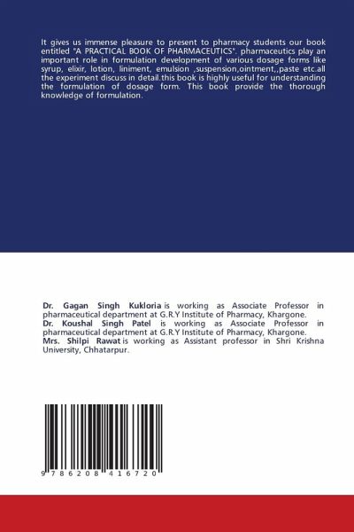 It gives us immense pleasure to present to pharmacy students our book entitled "A PRACTICAL BOOK OF PHARMACEUTICS". pharmaceutics play an important role in formulation development of various dosage forms like syrup, elixir, lotion, liniment, emulsion ,suspension,ointment,,paste etc.all the experiment discuss in detail.this book is highly useful for understanding the formulation of dosage form. This book provide the thorough knowledge of formulation.