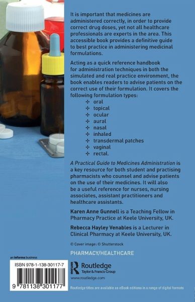 It is important that medicines are administered correctly, in order to provide correct drug doses, yet not all healthcare professionals are expert in the area. This accessible book provides a definitive guide to best practice in administering medicinal formulations. Acting as a quick reference handbook for administration techniques in both the simulated and real practice environment, the book enables readers to advise patients on the correct use of their formulation. It covers the following formulation types: oral topical ocular aural nasal inhaled transdermal patches vaginal rectal. A Practical Guide to Medicines Administration is a key resource for both student and practising pharmacists who counsel and advise patients on the use of their medicines. It will also be a useful reference for nurses, nursing associates, assistant practitioners and healthcare assistants.