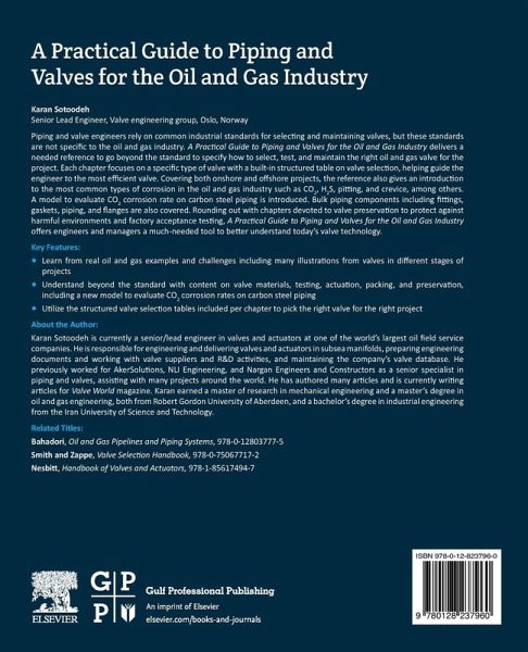 A Practical Guide to Piping and Valves for the Oil and Gas Industry covers how to select, test and maintain the right oil and gas valve. Each chapter focuses on a specific type of valve with a built-in structured table on valve selection. Covering both onshore and offshore projects, the book also gives an introduction to the most common types of corrosion in the oil and gas industry, including CO2, H2S, pitting, crevice, and more. A model to evaluate CO2 corrosion rate on carbon steel piping is introduced, along with discussions on bulk piping components, including fittings, gaskets, piping and flanges. Rounding out with chapters devoted to valve preservation to protect against harmful environments and factory acceptance testing, this book gives engineers and managers a much-needed tool to better understand today's valve technology.