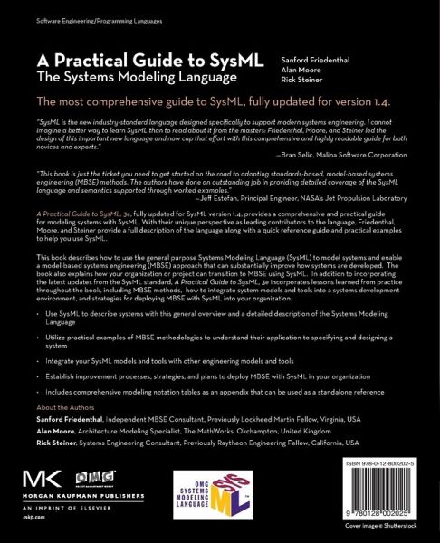 A Practical Guide to SysML, Third Edition, fully updated for SysML version 1.4, provides a comprehensive and practical guide for modeling systems with SysML. With their unique perspective as leading contributors to the language, Friedenthal, Moore, and Steiner provide a full description of the language along with a quick reference guide and practical examples to help you use SysML.