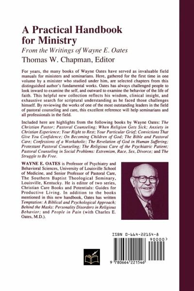 For years, the many books of Wayne Oates have served as invaluable field manuals for ministers and seminarians. Here, for the first time in one volume and by a minister who studied with him, are selected chapters from this distinguished author's fundamental works. This helpful new book reflects Oates's wisdom, clinical insight, and exhaustive search for scriptural understanding.