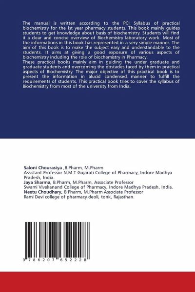 The manual is written according to the PCI Syllabus of practical biochemistry for the Ist year pharmacy students. This book mainly guides students to get knowledge about basis of biochemistry. Students will find it a clear and concise overview of Biochemistry laboratory work. Most of the informations in this book has represented in a very simple manner. The aim of this book is to make the subject easy and understandable to the students. It aims at giving a good exposure of various aspects of biochemistry including the role of biochemistry in Pharmacy.These practical books mainly aim in guiding the under graduate and graduate students and overcoming the obstacles faced by them in practical aspects of Biochemistry. The major objective of this practical book is to present the information in alucid condensed manner to fulfill the requirements of students. This practical book tries to cover the syllabus of Biochemistry from most of the university from India.