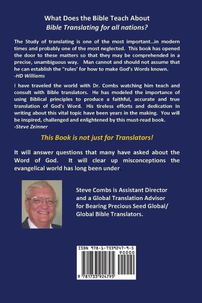 The Study of translating is one of the most important in modern times and probably one of the most neglected. All Christians will profit from this book. You will be inspired, challenged and enlightened by this must-read book. A careful reading of this book will assist translators around the world to come to a knowledge of what God expects from those handling His Words "to make them known." Man cannot and should not assume that he can establish the "rules' for how to "make them known," because God has " magnified [His] word above all [His] name" (Psalm 138:2f),and the following verse indicates how high He has exalted His name. This book shows the "why" and the "how" to carry over God's Words into the languages of the world, according to God's standards, not man's. This book is not just for translators. It is for all Christians who love the Word of God. Textual scholars have taught us that we still do not yet fully know what the original Scriptures said. They tell us all our Bibles have places that are uncertain and may have errors. But, God has inspired and preserved all His Words. We can be fully confident that every word of God is available to us. This book can build confidence in the Bible. It will lift your view of God's Word and encourage your faith. Dr. Combs' qualifications to author this book are evident by his extensive research and teaching of translation. He has spent many years consulting with translators, studying and gleaning from the scriptures. He has modeled the importance of using Biblical principles to produce a faithful, accurate and true translation of God's Word. Writing about this vital topic is the result of labor that has been years in the making. You will be inspired, challenged and enlightened by this must-read book.