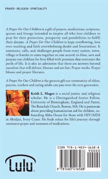 A Prayer For Our Children is a gift of prayers, meditations, scriptures, quotes and liturgy intended to inspire all who love children to pray for their protection, prosperity and possibilities to fulfill their dreams. A Prayer For Our Children is hope overflowing, love over-reaching and faith overwhelming doubt and frustrations. It summons, calls, and challenges people from every nation, town, village or hamlet to come together on one accord: to bless, save and prepare our children for lives filled with promises that overcome the perils of life. It is also an admission that there are answers beyond ourselves that will deliver, liberate and set free. Prayer works. Prayer blesses and prayer liberates. A Prayer For Our Children is the greatest gift our community of elders, parents, teachers and caring adults can pass onto the next generation.
