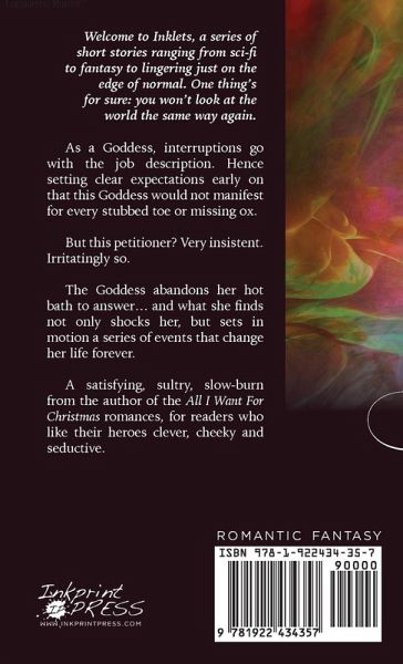 As a Goddess, interruptions go with the job description. Hence setting clear expectations early on that this Goddess would not manifest for every stubbed toe or missing ox. But this petitioner? Very insistent. Irritatingly so. The Goddess abandons her hot bath to answer... and what she finds not only shocks her, but sets in motion a series of events that change her life forever. A satisfying, sultry, slow-burn from the author of the All I Want For Christmas romances, for readers who like their heroes clever, cheeky and seductive.