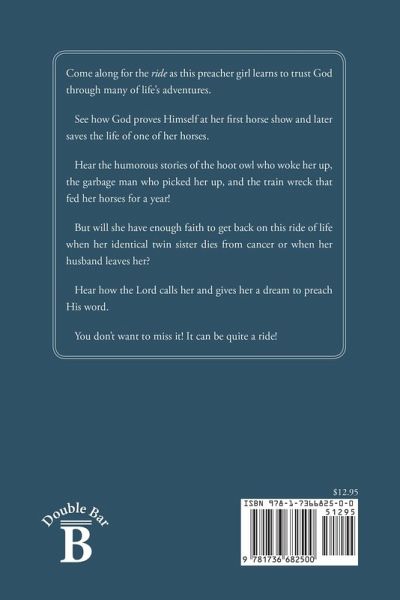 Come along for the ride as this preacher girl learns to trust God through many of life's adventures. See how God proves Himself at her first horse show and later saves the life of one of her horses. Hear the humorous stories of the hoot owl who woke her up, the garbage man who picked her up, and the train wreck that fed her horses for a year! But will she have enough faith to get back on this ride of life when her identical twin sister dies from cancer or when her husband leaves her? Hear how the Lord calls her and gives her a dream to preach His Word. You don't want to miss it! It can be quite a ride!