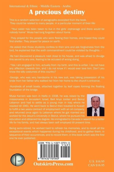 A precious destiny This is a random selection of paragraphs excerpted from the book. They could be related to many people, in a particular moment of their life: -"Your sister has been taken to live in the girls' orphanage and there would be nobody home" Musa had long forgotten about home.. -They prayed for the people who were fleeing their homes, and hoped they could find shelter. They prayed for peace on earth. -He asked that those students confess to their sins and ask forgiveness from the lord, he explained that the sixth commandment could be violated by thoughts. - -He had discovered a pleasure nest close to his house, and was afraid to divulge this secret to any one, fearing to be accused of wrong doing. -"Yes I am engaged to him, actually from my birth, and this is unfair. I do not have any affection towards him, and I do not know if I would ever love him. Don't you know the silly costumes of this country? -George, who was very handsome in his new suit, was taking possession of his bride from her father who walked her from her home to the church's entrance. -Hundreds of small boats, attached together by leaf ropes forming the floating foundation of the bridge.