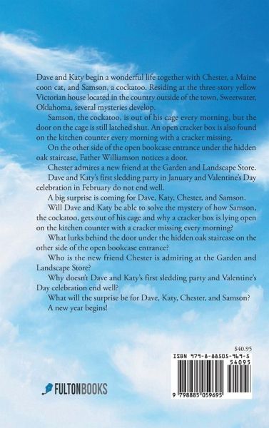 Dave and Katy begin a wonderful life together with Chester, a Maine coon cat, and Samson, a cockatoo. Residing at the three-story yellow Victorian house located in the country outside of the town, Sweetwater, Oklahoma, several mysteries develop. Samson, the cockatoo, is out of his cage every morning, but the door on the cage is still latched shut. An open cracker box is also found on the kitchen counter every morning with a cracker missing. On the other side of the open bookcase entrance under the hidden oak staircase, Father Williamson notices a door. Chester admires a new friend at the Garden and Landscape Store. Dave and Katy's first sledding party in January and Valentine's Day celebration in February do not end well. A big surprise is coming for Dave, Katy, Chester, and Samson. Will Dave and Katy be able to solve the mystery of how Samson, the cockatoo, gets out of his cage and why a cracker box is lying open on the kitchen counter with a cracker missing every morning? What lurks behind the door under the hidden oak staircase on the other side of the open bookcase entrance? Who is the new friend Chester is admiring at the Garden and Landscape Store? Why doesn't Dave and Katy's first sledding party and Valentine's Day celebration end well? What will the surprise be for Dave, Katy, Chester, and Samson? A new year begins!