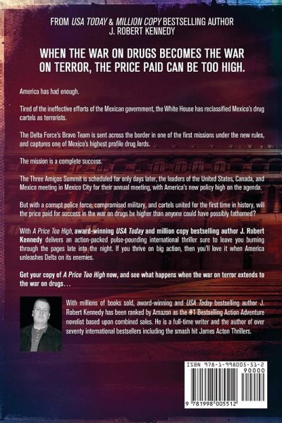 "One of the best writers today." (Johnny Olsen) / "A master storyteller." (Betty Richard) FROM USA TODAY & MULTI-MILLION COPY BESTSELLING AUTHOR J. ROBERT KENNEDY WHEN THE WAR ON DRUGS BECOMES THE WAR ON TERROR THE PRICE PAID CAN BE TOO HIGH. America has had enough. Tired of the ineffective efforts of the Mexican government, the White House has reclassified Mexico's drug cartels as terrorists. The Delta Force's Bravo Team is sent across the border in one of the first missions under the new rules, and captures one of Mexico's highest profile drug lords. The mission is a complete success. The Three Amigos Summit is scheduled for only days later, the leaders of the United States, Canada, and Mexico meeting in Mexico City for their annual meeting, with America's new policy high on the agenda. But with a corrupt police force, compromised military, and cartels united for the first time in history, will the price paid for success in the war on drugs be higher than anyone could have possibly fathomed? With A Price Too High, award-winning USA Today and multi-million copy bestselling author J. Robert Kennedy delivers an action-packed pulse-pounding international thriller sure to leave you burning through the pages late into the night. If you thrive on big action, then you'll love it when America unleashes Delta on its enemies. Get your copy of A Price Too High now, and see what happens when the war on terror extends to the war on drugs...
