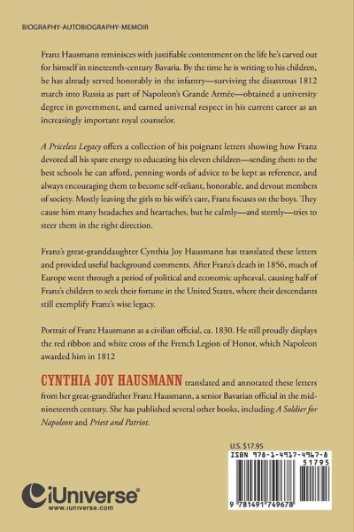 Franz Hausmann reminisces with justifiable contentment on the life he's carved out for himself in nineteenth-century Bavaria. By the time he is writing to his children, he has already served honorably in the infantry-surviving the disastrous 1812 march into Russia as part of Napoleon's Grande Armée-obtained a university degree in government, and earned universal respect in his current career as an increasingly important royal counselor. A Priceless Legacy offers a collection of his poignant letters showing how Franz devoted all his spare energy to educating his eleven children-sending them to the best schools he can afford, penning words of advice to be kept as reference, and always encouraging them to become self-reliant, honorable, and devout members of society. Mostly leaving the girls to his wife's care, Franz focuses on the boys. They cause him many headaches and heartaches, but he calmly-and sternly-tries to steer them in the right direction. Franz's great-granddaughter Cynthia Joy Hausmann has translated these letters and provided useful background comments. After Franz's death in 1856, much of Europe went through a period of political and economic upheaval, causing half of Franz's children to seek their fortune in the United States, where their descendants still exemplify Franz's wise legacy. Portrait of Franz Hausmann as a civilian official, ca. 1830. He still proudly displays the red ribbon and white cross of the French Legion of Honor, which Napoleon awarded him in 1812