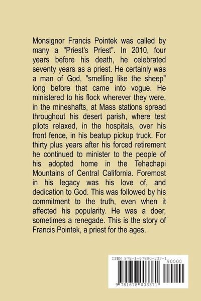 Monsignor Francis Pointek was called by many a "Priest's Priest". He lived for 101 years, serving as a priest in the vast California deserts and valleys for seventy four of those years. He followed in the footsteps of Father John Crowley, the legendary "Desert Padre". He was often dubbed by the same name. Monsignor Pointek was a priest of the people, "smelling like the sheep" long before that phrase came into vogue. He ministered to people where they were, in the mines, at the military bases, on the reservations, in the hospitals, in the homes, in the fields, in the detention camps. He was a doer, building four churches, two schools and a convent; always on limited funds, often with his own hands. He was a seeker of truth, even when the truth affected his popularity. He was a renegade, frequently choosing to act first and ask for permission and forgiveness later. This led to more than one disagreement with his bishop. Ultimately, his unconventional style led to an early forced retirement. But this didn't stop him, it didn't even slow him down. For the next forty-three years he served the people of Tehachapi, his adopted town, when and where he was needed. He ministered in the local parish, in the restaurants, in the stores, in the hospitals, in the homes, over his yard fence, from his beat up pickup truck. Arguably, his best ministry was conducted in his retirement years. He was driven by an immense love of God and his people. He was humble and lived in poverty, choosing only to emulate his hero, Jesus Christ. This is the story of Monsignor Francis Pointek, his legend and his legacy. His story is inspirational, the kind that we need in these crazy times. Monsignor Pointek, a priest for the ages.