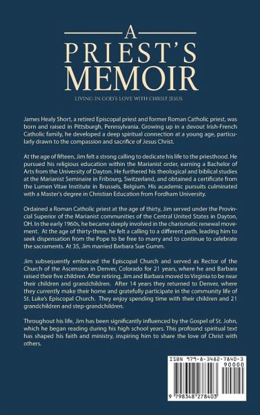 James Healy Short, a retired Episcopal priest and former Roman Catholic priest, was born and raised in Pittsburgh, Pennsylvania. Growing up in a devout Irish-French Catholic family, he developed a deep spiritual connection at a young age, particularly drawn to the compassion and sacrifice of Jesus Christ. At the age of fifteen, Jim felt a strong calling to dedicate his life to the priesthood. He pursued his religious education within the Marianist order, earning a Bachelor of Arts from the University of Dayton. He furthered his theological and biblical studies at the Marianist Seminarie in Fribourg, Switzerland, and obtained a certificate from the Lumen Vitae Institute in Brussels, Belgium. His academic pursuits culminated with a Master's degree in Christian Education from Fordham University. Ordained a Roman Catholic priest at the age of thirty, Jim served under the Provincial Superior of the Marianist communities of the Central United States in Dayton, OH. In the early 1960s, he became deeply involved in the charismatic renewal movement. At the age of thirty-three, he felt a calling to a different path, leading him to seek dispensation from the Pope to be free to marry and to continue to celebrate the sacraments. At 35, Jim married Barbara Sue Gumm. Jim subsequently embraced the Episcopal Church and served as Rector of the Church of the Ascension in Denver, Colorado for 21 years, where he and Barbara raised their five children. After retiring, Jim and Barbara moved to Virginia to be near their children and grandchildren. After 14 years they returned to Denver, where they currently make their home and gratefully participate in the community life of St. Luke's Episcopal Church. They enjoy spending time with their children and 21 grandchildren and step-grandchildren. Throughout his life, Jim has been significantly influenced by the Gospel of St. John, which he began reading during his high school years. This profound spiritual text has shaped his faith and ministry, inspiring him to share the love of Christ with others.
