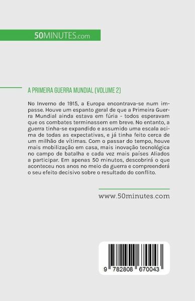 No Inverno de 1915, a Europa encontrava-se num impasse. Houve um espanto geral de que a Primeira Guerra Mundial ainda estava em fúria - todos esperavam que os combates terminassem em breve. No entanto, a guerra tinha-se expandido e assumido uma escala acima de todas as expectativas, e já tinha feito cerca de um milhão de vítimas. Com o passar do tempo, houve mais mobilização em casa, mais inovação tecnológica no campo de batalha e cada vez mais países Aliados a participar. Em apenas 50 minutos, descobrirá o que aconteceu nos anos no meio da guerra e compreenderá o seu efeito decisivo sobre o resultado do conflito. Este livro simples e informativo proporciona uma discussão aprofundada dos momentos chave nos anos intercalares da guerra, incluindo o impasse que foi alcançado, o tratado de paz da Rússia com a Alemanha (o Tratado de Brest-Litovsk) e a entrada dos Estados Unidos na guerra. Inclui também uma panorâmica completa da situação entre 1915 e 1917, a procura de um avanço e o ponto de viragem de 1917, dando-lhe toda a informação essencial sobre este período crucial da Primeira Guerra Mundial.