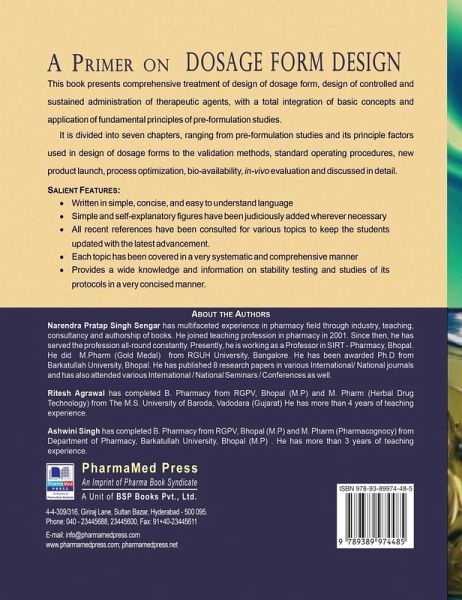 This book presents a comprehensive treatment of the design of dosage forms, design of controlled and sustained administration of therapeutic agents, with a total integration of basic concepts and application of fundamental principles of pre-formulation studies. It is divided into seven chapters, ranging from pre-formulation studies and its principle factors used in the design of dosage forms to the validation methods, standard operating procedures, new product launch, process optimization, bio-availability, in-vivo evaluation are discussed in detail. Salient Features: Written in simple, concise, and easy to understand language Simple and self-explanatory figures have been judiciously added wherever necessary All recent references have been consulted for various topics to keep the students updated with the latest advancement. Each topic has been covered in a very systematic and comprehensive manner Provides a wide knowledge and information on stability testing and studies of its protocols in a very concise manner.