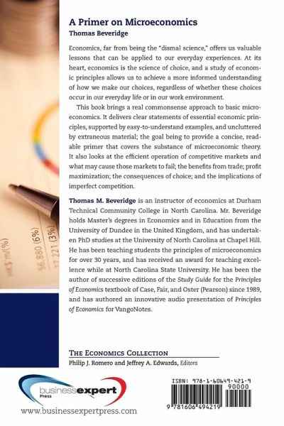 Economics, far from being the "dismal science," offers us valuable lessons that can be applied to our everyday experiences. At its heart, economics is the science of choice, and a study of economic principles allows us to achieve a more informed understanding of how we make our choices, regardless of whether these choices occur in our everyday life or in our work environment. This book brings a real commonsense approach to basic microeconomics. It delivers clear statements of essential economic principles, supported by easy-to-understand examples, and uncluttered by extraneous material; the goal being to provide a concise, readable primer that covers the substance of microeconomic theory. It also looks at the efficient operation of competitive markets and what may cause those markets to fail; the benefits from trade; profit maximization; the consequences of choice; and the implications of imperfect competition.