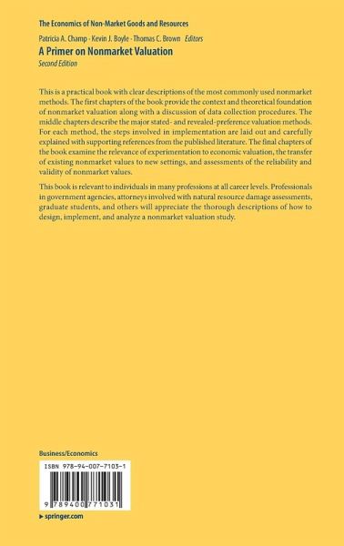 This is a practical book with clear descriptions of the most commonly used nonmarket methods. The first chapters of the book provide the context and theoretical foundation of nonmarket valuation along with a discussion of data collection procedures. The middle chapters describe the major stated- and revealed-preference valuation methods. For each method, the steps involved in implementation are laid out and carefully explained with supporting references from the published literature. The final chapters of the book examine the relevance of experimentation to economic valuation, the transfer of existing nonmarket values to new settings, and assessments of the reliability and validity of nonmarket values.