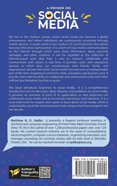 We live in the modern society where social media has become a global phenomenon and where individuals are continuously connected through mobile devices. A social media is any medium of communication that allows two-way interactive participation. It is a form of mass media communications on the Internet through which users share information, ideas, personal messages, and other contents. It can be regarded as the collection of Internet-based tools that help a user to connect, collaborate, and communicate with others in real time. It provides users with interactive services in which they can communicate with friends, family, and organizations all over the world. Social media have become an indispensable part of life, from shopping to electronic mails, education, and business tool. It provide users with the ability to collaborate and communicate with each other without any limitations by time or space. This book introduces beginners to social media. It is a comprehensive introductory text on the issues, ideas, theories, and problems on social media. It provides an overview of each of its applications so that beginners can understand social media and its increasing importance and relevance. It is a must-read book for anyone who wants to learn about social media, which is undoubtedly one of the most important technologies that has emerged in the last decade.