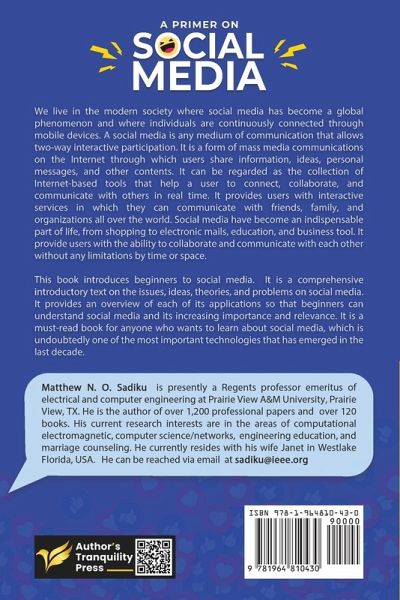We live in the modern society where social media has become a global phenomenon and where individuals are continuously connected through mobile devices. A social media is any medium of communication that allows two-way interactive participation. It is a form of mass media communications on the Internet through which users share information, ideas, personal messages, and other contents. It can be regarded as the collection of Internet-based tools that help a user to connect, collaborate, and communicate with others in real time. It provides users with interactive services in which they can communicate with friends, family, and organizations all over the world. Social media have become an indispensable part of life, from shopping to electronic mails, education, and business tool. It provide users with the ability to collaborate and communicate with each other without any limitations by time or space. This book introduces beginners to social media. It is a comprehensive introductory text on the issues, ideas, theories, and problems on social media. It provides an overview of each of its applications so that beginners can understand social media and its increasing importance and relevance. It is a must-read book for anyone who wants to learn about social media, which is undoubtedly one of the most important technologies that has emerged in the last decade.
