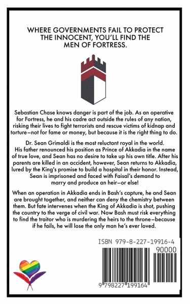 Where governments fail to protect the innocent, you'll find the men of Fortress. Sebastian Chase knows danger is part of the job. As an operative for Fortress, he and his cadre act outside the rules of any nation, risking their lives to fight terrorists and rescue victims of kidnapping and torture -- not for fame or money, but because it is the right thing to do. Dr. Sean Grimaldi is the most reluctant royal in the world. His father renounced his position as Prince of Akkadia in the name of true love, and Sean has no desire to take up his own title. After his parents are killed in an accident, however, Sean returns to Akkadia, lured by the King's promise to build a hospital in their honor. Instead, Sean is imprisoned and faced with Faisal's demand to marry and produce an heir -- or else! When an operation in Akkadia ends in Bash's capture, he and Sean are brought together, and neither can deny the chemistry between them. But fate intervenes when the King of Akkadia is shot, pushing the country to the verge of civil war. Now Bash must risk everything to find the traitor who is murdering the heirs to the throne -- because if he fails, he will lose the only man he's ever loved.