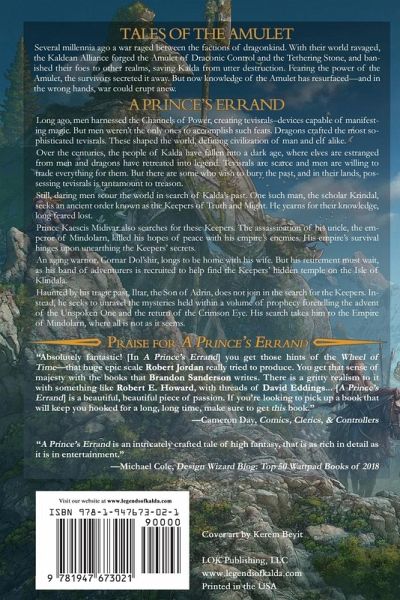 Award-Winning Finalist: 2020 International Book Awards for Fantasy Finalist: 2019 OZMA Book Awards for Fantasy Semi-Finalist: 2018 Watty Awards #1 New Release in Classic Fantasy A Prince's Errand, Book One of Tales of the Amulet begins an exciting new epic fantasy saga. Several millennia ago a war raged between the factions of dragonkind. With their world ravaged, the Kaldean Alliance forged the Amulet of Draconic Control and the Tethering Stone, and banished their foes to other realms, saving Kalda from utter destruction. Fearing the power of the Amulet, the survivors secreted it away. But now knowledge of the Amulet has resurfaced-and in the wrong hands, war could erupt anew. A PRINCE'S ERRAND Long ago, men harnessed the Channels of Power, creating tevisrals-devices capable of manifesting magic. But men weren't the only ones to accomplish such feats. Dragons crafted the most sophisticated tevisrals. These shaped the world, defining civilization of man and elf alike. Over the centuries, the people of Kalda have fallen into a dark age, where elves are estranged from men and dragons have retreated into legend. Tevisrals are scarce and men are willing to trade everything for them. But there are some who wish to bury the past, and in their lands, possessing tevisrals is tantamount to treason. Still, daring men scour the world in search of Kalda's past. One such man, the scholar Krindal, seeks an ancient order known as the Keepers of Truth and Might. He yearns for their knowledge, long feared lost. Prince Kaescis Midivar also searches for these Keepers. The assassination of his uncle, the emperor of Mindolarn, killed his hopes of peace with his empire's enemies. His empire's survival hinges upon unearthing the Keepers' secrets. An aging warrior, Cornar Dol'shir, longs to be home with his wife. But his retirement must wait, as his band of adventurers is recruited to help find the Keepers' hidden temple on the Isle of Klindala. Haunted by his tragic past, Iltar, the Son of Adrin, does not join in the search for the Keepers. Instead, he seeks to unravel the mysteries held within a volume of prophecy foretelling the advent of the Unspoken One and the return of the Crimson Eye. His search takes him to the Empire of Mindolarn, where all is not as it seems. An ancient war was won by a simple amulet. It brought peace, but in the wrong hands it could spell a doom the likes of which no world has ever seen. May the Crimson Eye remain hidden for all time...