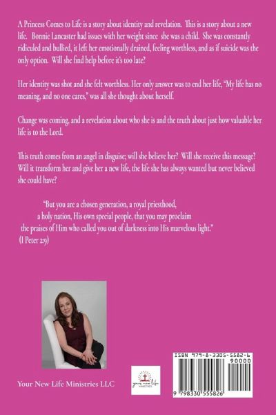 A Princess Comes to Life is a story about identity and revelation. This is a story about a new life. Bonnie Lancaster had issues with her weight since she was a child. She was constantly ridiculed and bullied, it left her emotionally drained, feeling worthless, and as if suicide was the only option. Will she find help before it's too late? Her identity was shot and she felt worthless. Her only answer was to end her life, "My life has no meaning, and no one cares," was all she thought about herself. Change was coming, and a revelation about who she is and the truth about just how valuable her life is to the Lord. This truth comes from an angel in disguise; will she believe her? Will she receive this message? Will it transform her and give her a new life, the life she has always wanted but never believed she could have? "But you are a chosen generation, a royal priesthood, a holy nation, His own special people, that you may proclaim the praises of Him who called you out of darkness into His marvelous light." (I Peter 2:9)