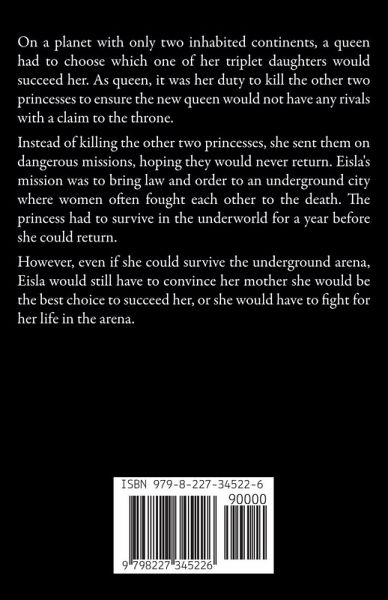 On a planet with only two inhabited continents, a queen had to choose which one of her triplet daughters would succeed her. As queen, it was her duty to kill the other two princesses to ensure the new queen would not have any rivals with a claim to the throne. Instead of killing the other two princesses, she sent them on dangerous missions, hoping they would never return. Eisla's mission was to bring law and order to an underground city where women often fought each other to the death. The princess had to survive in the underworld for a year before she could return. However, even if she could survive the underground arena, Eisla would still have to convince her mother she would be the best choice to succeed her, or she would have to fight for her life in the arena.