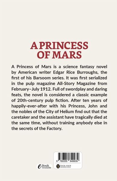 A Princess of Mars is a science fantasy novel by American writer Edgar Rice Burroughs, the first of his Barsoom series. It was first serialized in the pulp magazine All-Story Magazine from February-July 1912. Full of swordplay and daring feats, the novel is considered a classic example of 20th-century pulp fiction. After ten years of happily-ever-after with his Princess, John and the nobles of the City of Helium find out that the caretaker and the assistant have tragically died at the same time, without training anybody else in the secrets of the Factory.