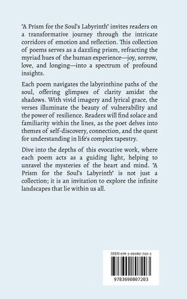 "A Prism for the Soul's Labyrinth" invites readers on a transformative journey through the intricate corridors of emotion and reflection. This collection of poems serves as a dazzling prism, refracting the myriad hues of the human experience-joy, sorrow, love, and longing-into a spectrum of profound insights. Each poem navigates the labyrinthine paths of the soul, offering glimpses of clarity amidst the shadows. With vivid imagery and lyrical grace, the verses illuminate the beauty of vulnerability and the power of resilience. Readers will find solace and familiarity within the lines, as the poet delves into themes of self-discovery, connection, and the quest for understanding in life's complex tapestry. Dive into the depths of this evocative work, where each poem acts as a guiding light, helping to unravel the mysteries of the heart and mind. "A Prism for the Soul's Labyrinth" is not just a collection; it is an invitation to explore the infinite landscapes that lie within us all.