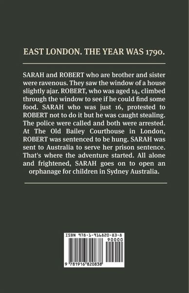 SARAH and ROBERT who are brother and sister were ravenous. They saw the window of a house slightly ajar. ROBERT, who was aged 14, climbed through the window to see if he could find some food. Sarah who was just 16, protested to ROBERT not to do it but he was caught stealing. The police were called and both were arrested. At The Old Bailey Courthouse in London, ROBERT was sentenced to be hung. SARAH was sent to Australia to serve her prison sentence. That's where the adventure started. All alone and frightened, SARAH goes on to open an orphanage for children in Sydney Australia.