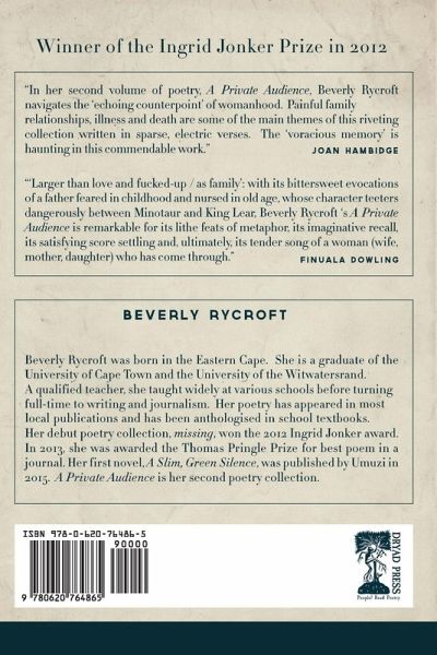 "In her second volume of poetry; A Private Audience, Beverly Rycroft navigates the 'echoing counterpoint' of womanhood. Painful family relationships, illness and death are some of the themes if this riveting collection written in sparse, electric verses. The 'voracious memory' is haunting in this commendable work." - JOAN HAMBIDGE