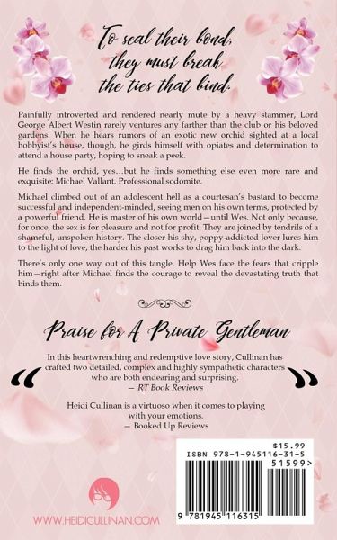 To seal their bond, they must break the ties that bind. Painfully introverted and rendered nearly mute by a heavy stammer, Lord George Albert Westin rarely ventures any farther than the club or his beloved gardens. When he hears rumors of an exotic new orchid sighted at a local hobbyist’s house, though, he girds himself with opiates and determination to attend a house party, hoping to sneak a peek. He finds the orchid, yes…but he finds something else even more rare and exquisite: Michael Vallant. Professional sodomite. Michael climbed out of an adolescent hell as a courtesan’s bastard to become successful and independent-minded, seeing men on his own terms, protected by a powerful friend. He is master of his own world—until Wes. Not only because, for once, the sex is for pleasure and not for profit. They are joined by tendrils of a shameful, unspoken history. The closer his shy, poppy-addicted lover lures him to the light of love, the harder his past works to drag him back into the dark. There’s only one way out of this tangle. Help Wes face the fears that cripple him—right after Michael finds the courage to reveal the devastating truth that binds them.