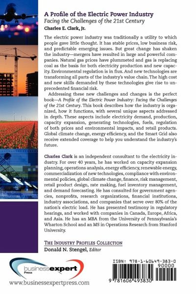 The electric power industry was traditionally a utility to which people gave little thought. It has stable prices, low business risk, and predictable emerging issues. But great change has shaken the industry-mergers have resulted in large and powerful companies. Natural gas prices have plummeted and gas is replacing coal as the basis for both electricity production and new capacity. Environmental regulation is in flux. And new technologies are transforming all parts of the industry's value chain. The high cost and new skills demanded by these technologies give rise to unprecedented financial risk. Addressing these new challenges and changes is the perfect book-A Profile of the Electric Power Industry: Facing the Challenges of the 21st Century. This book describes how the industry is organized, how it functions, with several unique aspects addressed in depth. These aspects include electricity demand, production, capacity expansion, generating technologies, fuels, regulation of both prices and environmental impacts, and retail products. Global climate change, energy efficiency, and the Smart Grid also receive extended coverage to help you understand the industry's future.