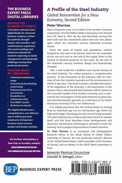 Steel companies were at the birth of the modern business corporation. The first billion dollar corporation ever formed was U.S. Steel in 1901. By the mid-twentieth century the steel mill and the automobile plant were the two pillars upon which the twentieth century industrial economy rested. Given the scale of capital and operations, vertical integration was seen to be pivotal, from the raw materials of iron ore and coal on one end of the supply chain to the myriad of finished products on the other. By the end of the twentieth century, however, things had dramatically changed. Take a look inside for a brilliant and concise history of the steel industry. The author presents a comprehensive account of the economics of the industry, with an overview of how the industry operates and the environment in which it operates. This book includes a detailed discussion of the regulation of the industry; a documentation of the reasons why a rejuvenated steel industry will be critical to the economic health of the modern economy; and a rationale for the reemergence of the steel industry in particular, and manufacturing in general, as a vital force in the North American economy of the new millennium. It is widely perceived that the United States is moving from an industrial age into an information age, driven by high technology. That image for steel is now being reversed. The steel industry has continuously been forced to remake itself, and this book describes those developments and dynamics. Information technology is pervasive across the industry and ecological improvement is steel intensive.