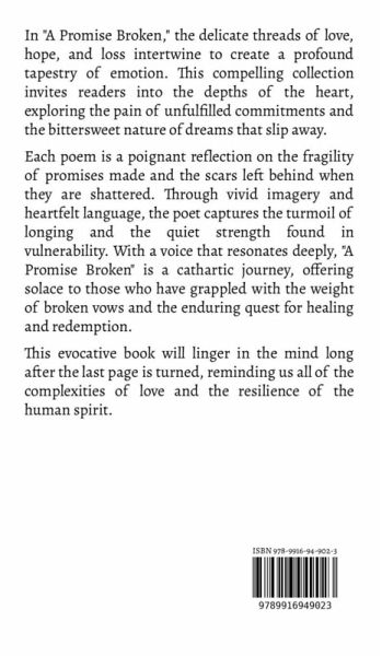 In "A Promise Broken," the delicate threads of love, hope, and loss intertwine to create a profound tapestry of emotion. This compelling collection invites readers into the depths of the heart, exploring the pain of unfulfilled commitments and the bittersweet nature of dreams that slip away. Each poem is a poignant reflection on the fragility of promises made and the scars left behind when they are shattered. Through vivid imagery and heartfelt language, the poet captures the turmoil of longing and the quiet strength found in vulnerability. With a voice that resonates deeply, "A Promise Broken" is a cathartic journey, offering solace to those who have grappled with the weight of broken vows and the enduring quest for healing and redemption. This evocative book will linger in the mind long after the last page is turned, reminding us all of the complexities of love and the resilience of the human spirit.