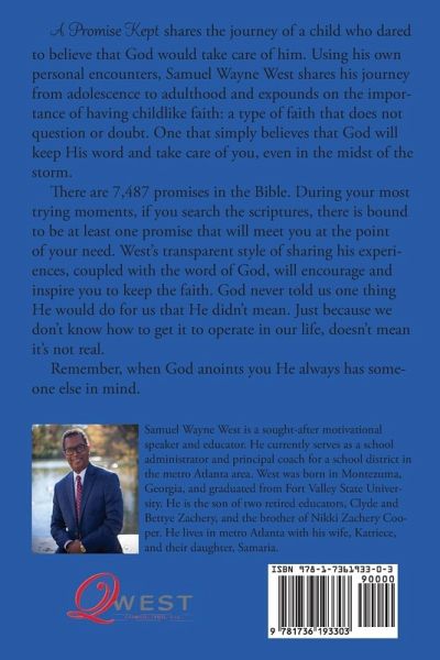 A Promise Kept shares the journey of a child who dared to believe that God would take care of him. Using his own personal encounters, Samuel Wayne West shares his journey from adolescence to adulthood and expounds on the importance of having childlike faith. A type of faith that does not question or doubt. One that simply believes that God will keep His word and take care of you. Even in the midst of the storm. There are 7,487 promises in the Bible. During your most trying moments, if you search the scriptures there is bound to be at least one promise that will meet you at the point of your need. Wests' transparent style of sharing his experiences coupled with the word of God will encourage and inspire you to keep the faith. God never told us one thing He would do for us that He didn't mean. Just because we don't know how to get it to operate in our life, doesn't mean it's not real. Remember, when God anoints you He always has someone else in mind.