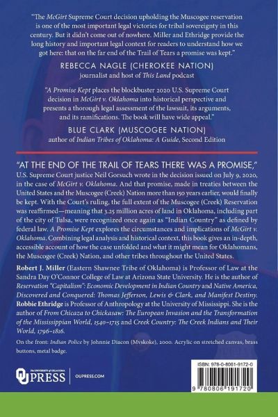 "At the end of the Trail of Tears there was a promise," U.S. Supreme Court Justice Neil Gorsuch wrote in a decision issued on July 9, 2020, in the case of McGirt v. Oklahoma. And that promise, made in treaties between the United States and the Muscogee (Creek) Nation more than 150 years earlier, would finally be kept. With the Court's ruling, the full extent of the Muscogee (Creek) Reservation was reaffirmed-meaning that 3.25 million acres of land in Oklahoma, including part of the city of Tulsa, were recognized once again as "Indian Country" as defined by federal law. A Promise Kept explores the circumstances and implications of McGirt v. Oklahoma, likely the most significant Indian law case in well over 100 years. Combining legal analysis and historical context, this book gives an in-depth, accessible account of how the case unfolded and what it might mean for Oklahomans, the Muscogee (Creek) Nation, and other tribes throughout the United States. For context, Robbie Ethridge traces the long history of the Muscogee (Creek) Nation from its inception in present-day Georgia and Alabama in the seventeenth century, through the tribe's rise to regional prominence in the colonial era, the tumultuous years of Indian Removal, the Civil War and allotment, into its resurgence in Oklahoma in the twentieth and twenty-first centuries. Against this historical background, Robert J. Miller considers McGirt v. Oklahoma, examining important related cases, precedents that informed the Court's decision, and future ramifications-legal, civil, regulatory, and practical-for the Muscogee (Creek) Nation, federal Indian law, the United States, the State of Oklahoma, and Indian nations in Oklahoma and elsewhere. Their work clarifies the stakes of a decision that, while long overdue, raises numerous complex issues profoundly affecting federal, state, and tribal relations and law-and will continue to do so for the foreseeable future.