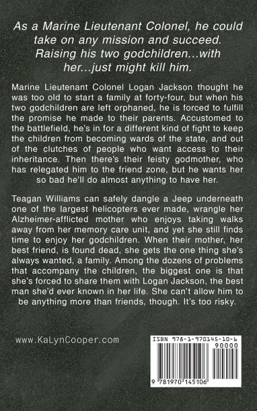 As a Marine Lieutenant Colonel, he could take on any mission and succeed. Raising his two godchildren…with her…just might kill him. Marine Lieutenant Colonel Logan Jackson thought he was too old to start a family at forty-four, but when his two godchildren are left orphaned, he is forced to fulfill the promise he made to their parents. Accustomed to the battlefield, he’s in for a different kind of fight to keep the children from becoming wards of the state, and out of the clutches of people who want access to their inheritance. Then there’s their feisty godmother, who has relegated him to the friend zone, but he wants her so bad he’ll do almost anything to have her. Teagan Williams can safely dangle a Jeep underneath one of the largest helicopters ever made, wrangle her Alzheimer-afflicted mother who enjoys taking walks away from her memory care unit, and yet she still finds time to enjoy her godchildren. When their mother, her best friend, is found dead, she gets the one thing she’s always wanted, a family. Among the dozens of problems that accompany the children, the biggest one is that she’s forced to share them with Logan Jackson, the best man she’d ever known in her life. She can’t allow him to be anything more than friends, though. It’s too risky.