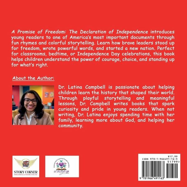 A Promise of Freedom: The Declaration of Independence introduces young readers to one of America's most important documents through fun rhymes and colorful storytelling. Learn how brave leaders stood up for freedom, wrote powerful words, and started a new nation. Perfect for classrooms, bedtime, or Independence Day celebrations, this book helps children understand the power of courage, choice, and standing up for what's right. About the Author: Dr. Latina Campbell is passionate about helping children learn the history that shaped their world. Through playful storytelling and meaningful lessons, Dr. Campbell writes books that spark curiosity and pride in young readers. When not writing, Dr. Latina enjoys spending time with her family, learning more about God, and helping her community.