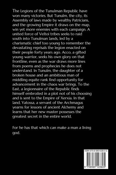 The Legions of the Tunulman Republic have won many victories. But Tunulm, the city, its Assembly of laws made by wealthy Patricians, and the growing Empire it draws on the map, win yet more enemies with each campaign. A united force of Veltoi tribes seeks to raid south into Tunulman lands, led by a charismatic chief too young to remember the devastating reprisals the legion enacted on their people forty years ago. Acco, a gifted young warrior, seeks his own glory on that frontline, even as the war draws more lines from poems and prophecies he does not understand. In Tunulm, the daughter of a broken house and an ambitious man of middling equite rank find opportunity for advancement in the chaos war brings. To the East, a legionnaire of the Republic finds himself embroiled in a plot not of his choosing, and is sent to the Empire of Xerxia. In that land, Yatossa, a servant of the Archmagus yearns for lessons of ancient Alchemy, and learns that her new master possesses the greatest secret in the entire world. For he has that which can make a man a living god.