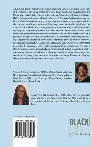 A Promising Reality: Reflections on Race, Gender, and Culture in Cuba is a compilation of the reflections of a group of chief diversity officers, faculty, and educators from the United States about Cuba. As part of the National Association of Diversity Officers in Higher Education delegation to Cuba in July, 2015, A Promising Reality represents a collection of voices, experiences, and perspectives about issues of race, gender, cultural identity, and the African experience in Cuba. Key themes explored include Cuban culture, the Cuban Revolution, politics, economics, education, equity, and social change. Utilizing narrative inquiry, some of the reflections are comparative with the United States, and some reflections focus exclusively on Cuba. The book takes readers on a journey of thought-provoking stories that reflect the excitement, uncertainty, complexity, and promising possibilities on the cusp of changing diplomatic, political, economic, and social relationships between the United States and Cuba. A Promising Reality seeks to broaden the perspectives of its readers regarding US-Cuban relations. This book is ideal for courses on international relations, international studies, international affairs, comparative cultures, political science, education, politics, sociology, history, race, gender, and social justice. It is a must-read for anyone traveling to Cuba as part of study-abroad, professional development, or personal adventure.